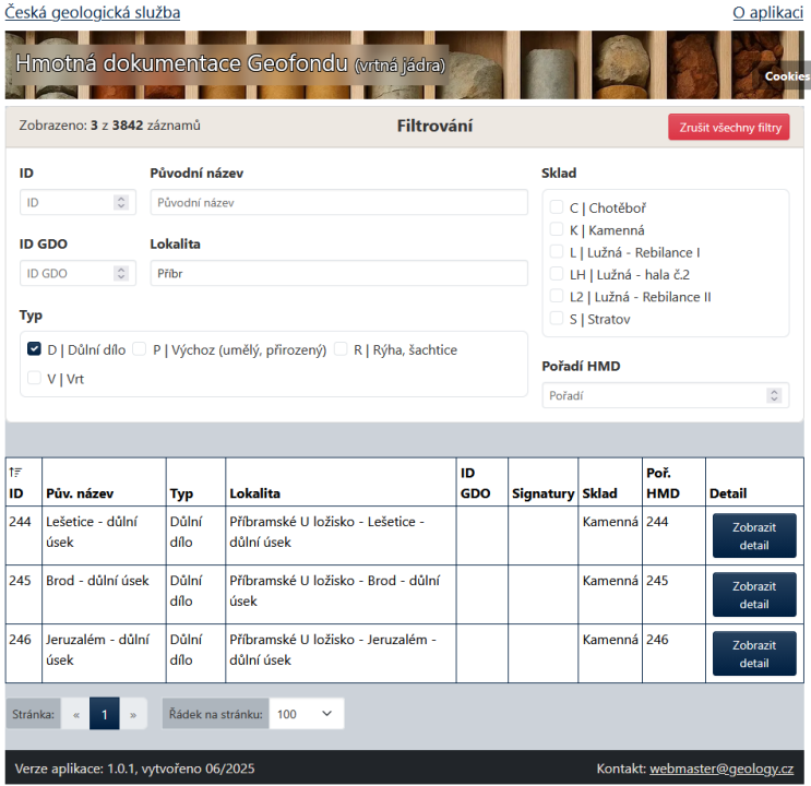 Databáze v tuto chvíli obsahuje přes 3800 záznamů a v aplikaci je možné vyhledávat podle typu vzorku, lokality, původního názvu vrtu či skladu ČGS, kde je vzorek uložen.