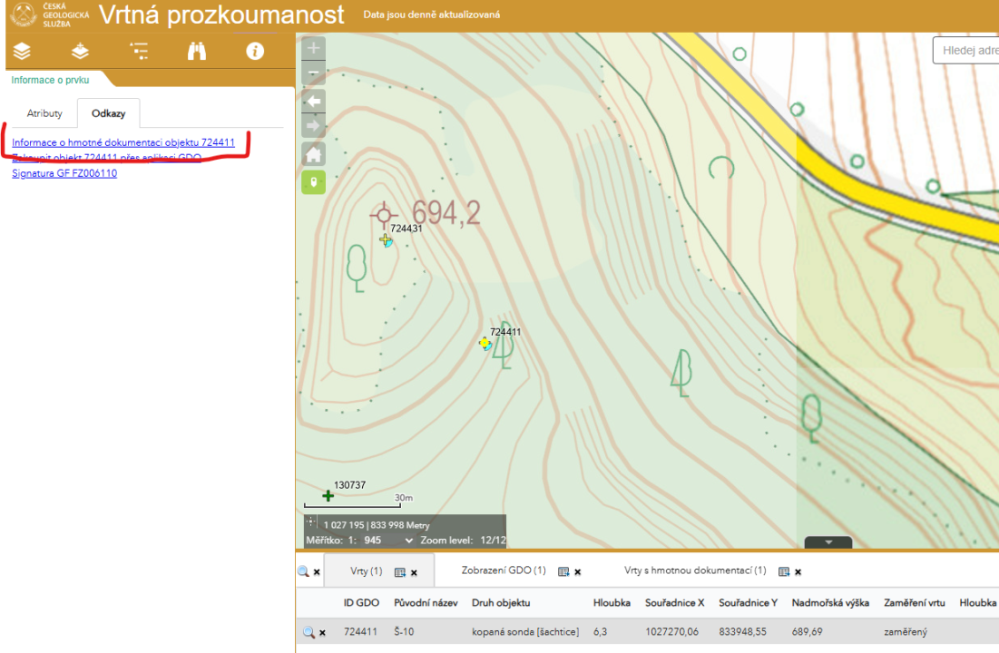 Odkazy na detail záznamu vrtu s hmotnou dokumentací jsou přístupné i z mapové aplikace Vrtná prozkoumanost. V této aplikaci byla současně pro lepší přehlednost upravena symbolika znázorňující vrty a jejich specifické výběry.