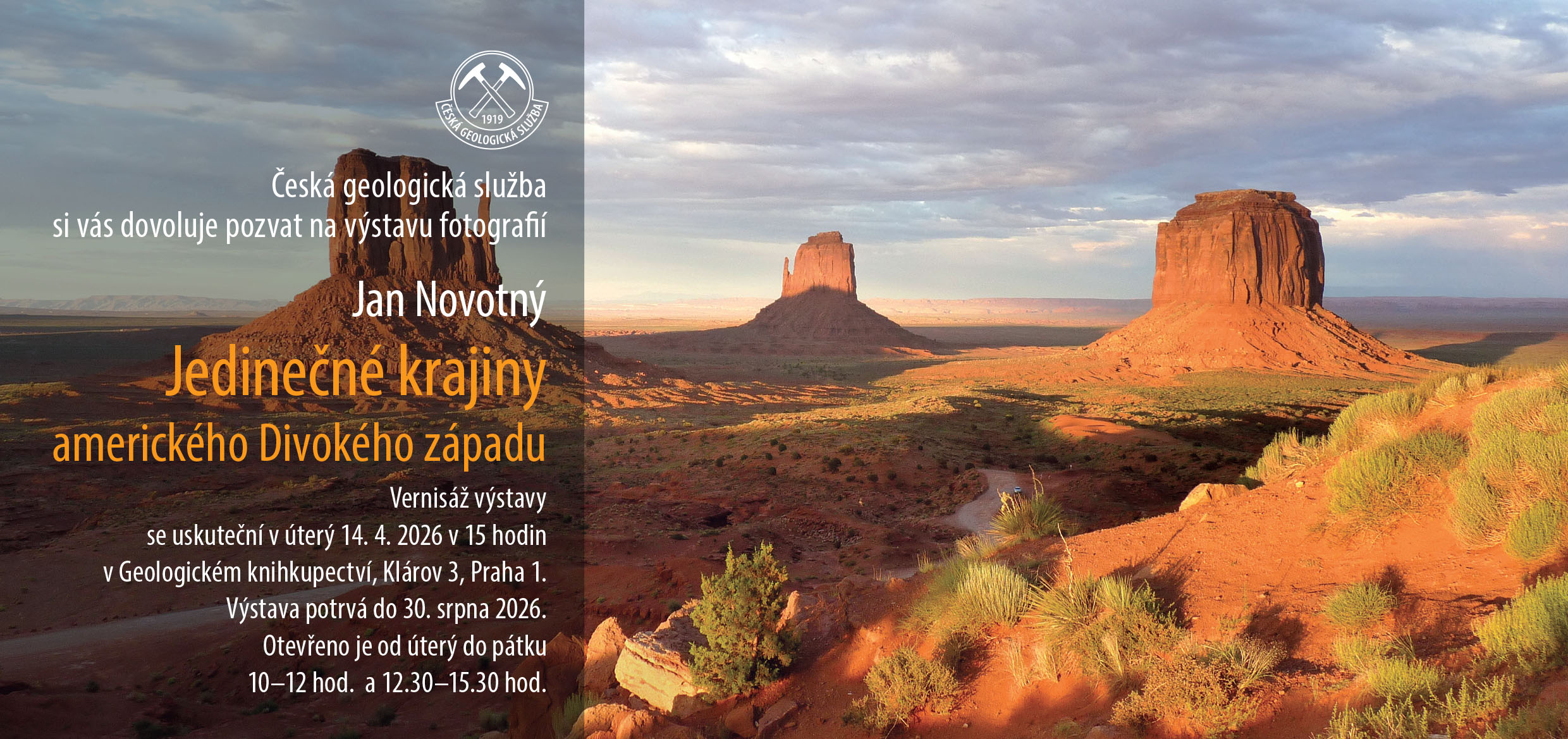 Pozvánka na výstavu fotografií Jana Novotného Jedinečné krajiny amerického Divokého západu 13.4.2026 Klára Froňková Česká geologická služba srdečně zve na výstavu fotografií Jana Novotného Jedinečné krajiny amerického Divokého západu.Vernisáž výstavy se uskuteční v úterý 14. 4. 2026 v 15 hodin v Geologickém knihkupectví (Klárov 3, Praha 1). Výstava potrvá do 30. srpna. Pozvánka na vernisáž Jan Novotný – Jedinečné krajiny amerického Divokého západu (jpg, 615.65 KB)